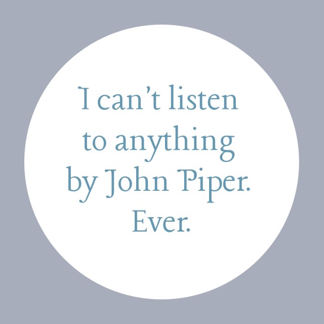 I can’t listen to anything said or written by John Piper. No books, no sermons, and nothing on this website. Yes, I’ve tried.
